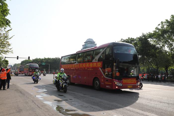 下午16點整,載著賀州支援湖北醫療隊的大巴車在33輛摩托車鐵騎、兩輛警車的引導護航下駛入賀州大道,警燈閃爍、警笛嘹亮,沿途市民揮舞國旗,夾道歡迎,高聲歡呼,壽城人民用最高禮遇,最深敬意,迎接英雄凱旋,表達對英雄的敬意。