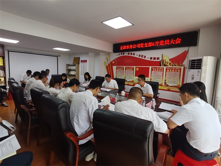 6月22日,市正源水務公司黨支部書記常瑜委托副書記林峰主持召開6月黨員大會,支部黨員、積極分子共20余人參加會議。