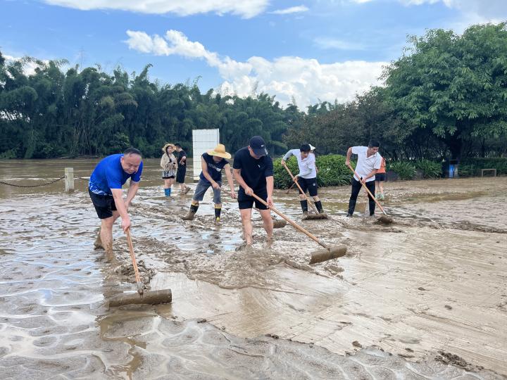 發(fā)布時間:2024-06-17 作者:文字:陳曉雯 圖片:程梅娟 來源: 審核:葉茂桃 吳姍近日,我市遭遇強(qiáng)降雨,賀江水位迅猛上漲,城區(qū)部分區(qū)域范圍遭受不同程度的災(zāi)害影響,沿江而建的北堤公園因河水上漲也被洪水淹沒。隨著洪水退去,大量淤泥、雜物殘留在北堤公園河岸兩側(cè)。為盡快恢復(fù)北堤公園美麗整潔面貌,6月16日,城市運(yùn)營公司副總經(jīng)理劉立忠率領(lǐng)城投物業(yè)公司全體干部職工攜帶高壓水管、鐵鏟、掃帚等工具趕赴北堤公園內(nèi)澇路段清理積水、淤泥。